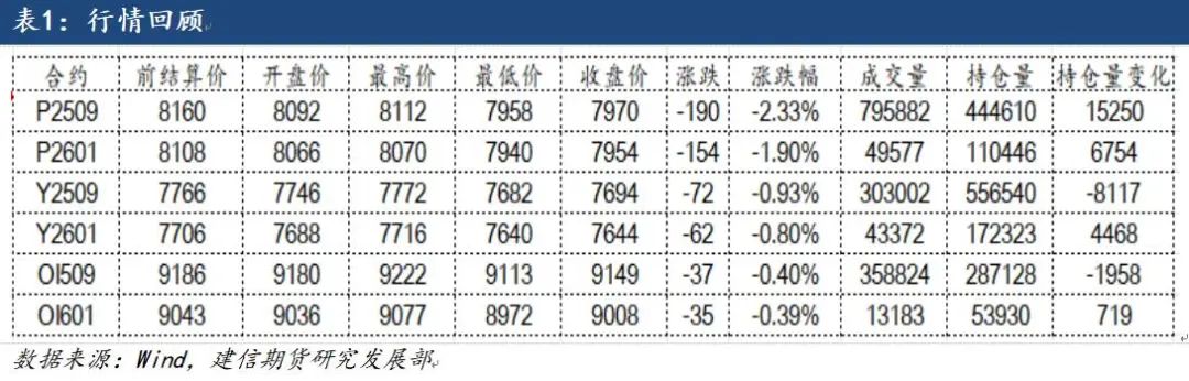 棕榈油领跌油脂板块。主力合约P2509增仓下挫,市场看空情绪较强,关注下方7800附近支撑,价格恐有进一步下跌可能。MPOB发布的最新数据显示,马来西亚5月份棕榈油库存涨至8个月来的最高水平,出口的强劲只是抵消了产量和进口的部分增长。因市场预期棕榈油库存将升至200万吨以上,该份报告对棕榈油略微利好。马来西亚前10日出口数据表现良好,支撑市场;但未来增产增库存为市场带来压力,中长期价格重心下移。菜油方面,虽中加重启谈判,但6-7月份之后菜籽买船偏少,国内现货和基差强势,并且国内榨利恶化,短期内9000位置支撑较强,后期重点关注中加谈判结果以及加拿大新季油菜籽生长天气。巴西充足的大豆供应继续对市场构成压力,关注近期大豆进口及压榨情况,供应形势改善可能给豆类油脂带来压力,随着后期工厂豆油库存的持续增加,现货基差报价依旧承压,对行情有拖累,有望震荡下跌,可持续做空虚值看涨期权。短期内油脂整体供应充足,缺乏向上驱动。风险在于天气、关税和各国生物柴油政策。